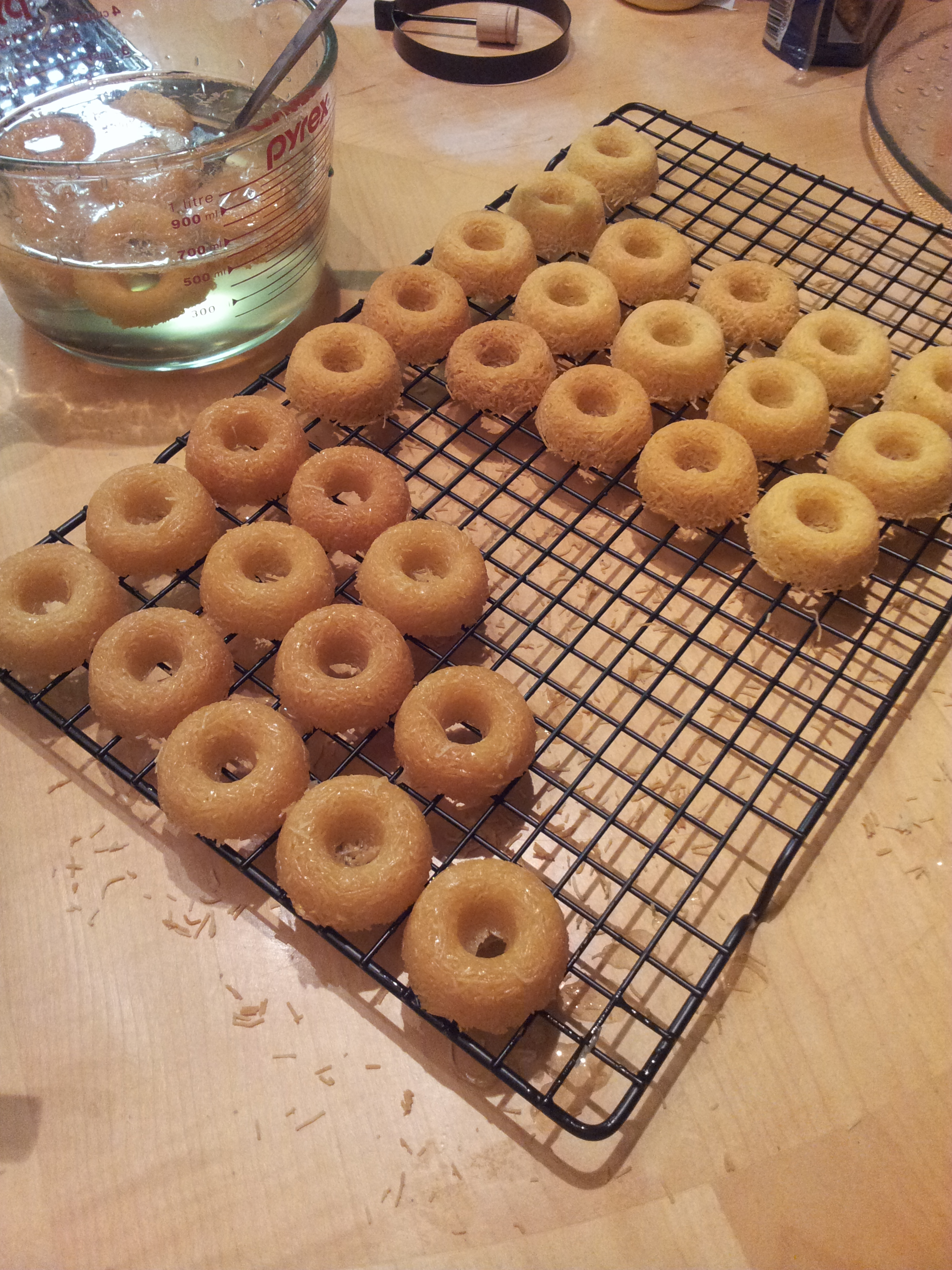 Take them out of the oil drain on paper towels then place them in the syrup. Remove them from the syrup let drain on a cooling rack.