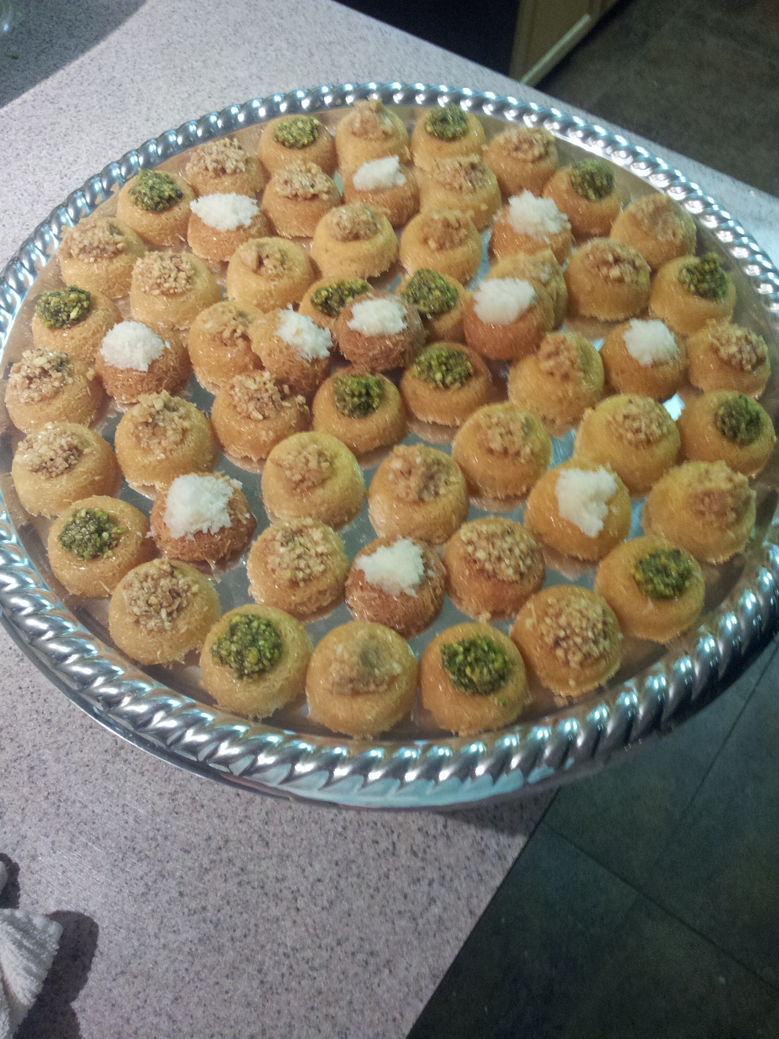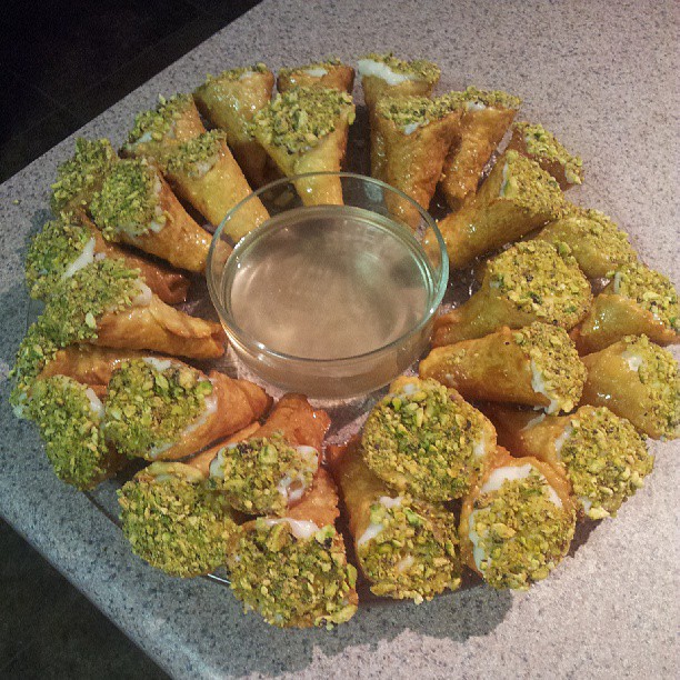 Fill the cavities with the cream قشطة and then dip into the ground pistachios.