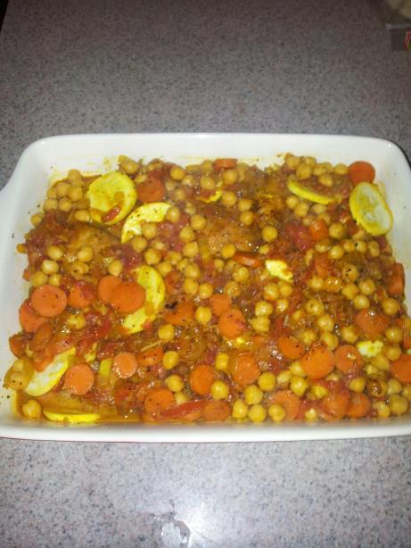 - Add chickpeas and zucchini to the pan and simmer once again; pour over chicken in casserole and bake at 350 degrees for 1 hour until chicken is tender and sauce has thickened. Serve over rice or couscous.